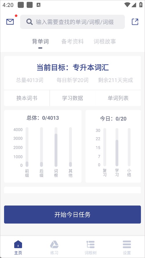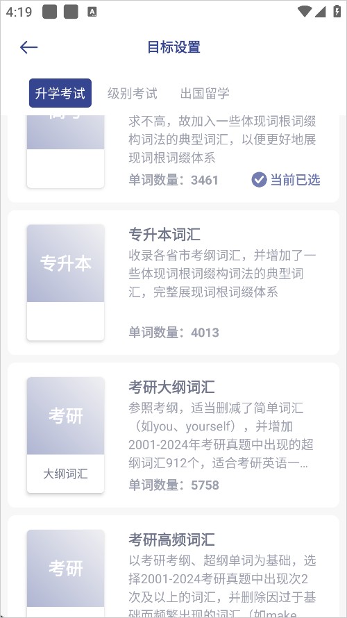 词根单词2025是一款背单词软件。软件为用户提供多种考试级别选择,用户根据自己的需求来进行选择。软件能够根据用户学习习惯进行推送,定制专属的学习计划并帮助用户实时进行单词的复习。需要的用户赶紧来下载吧。