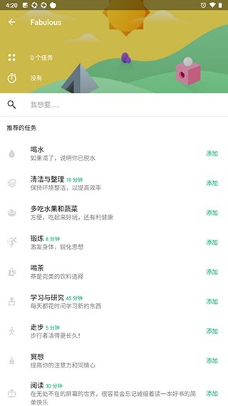 3、进入后可以设置自己要完成的事情,比如喝水、锻炼、阅读等,点击添加即可加入到打卡任务。