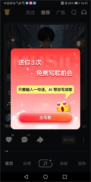 1、新用户登录app后就有免费使用次数进行ai写歌