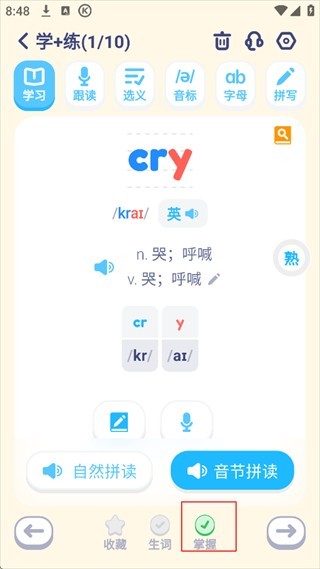 5、随后就可以开始背了,感觉掌握了这个单词就可以点击下方的掌握,进行下一个单词