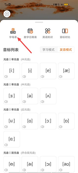1.每个音标就能开启学习,前元音、中元音点击播放了解详细的读法