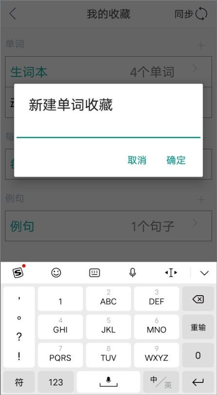 2、如果想将特殊的单词加入到其他生词本,可以在右下的“学习”->“我的收藏”里的“单词”的最右边点“+”,系统会弹出“新建单词收藏”对话框,这里可以在输入框里输入你需要创建的生词本分类关键词,点击“确定”即可完成。