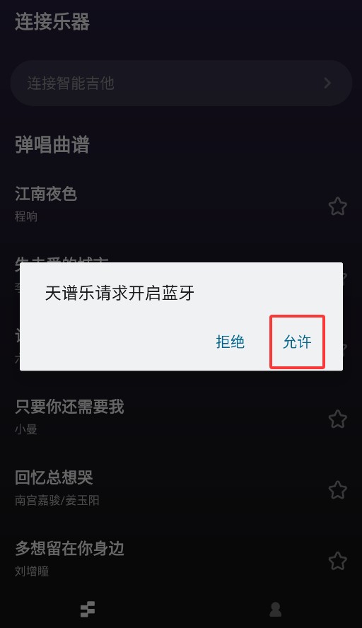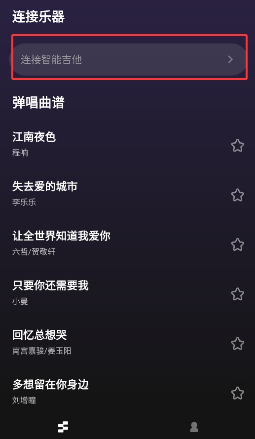 1、启动APP后,点击主界面"连接智能吉他"按钮,快速进入设备配对模式。