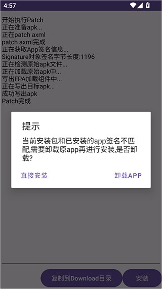 2.做完以后我们点击安装,这时候会提示当前安装包个已安装的APO签名不匹配,需要卸载原APP,我们点击卸载即可,卸载完了以后点击安装。