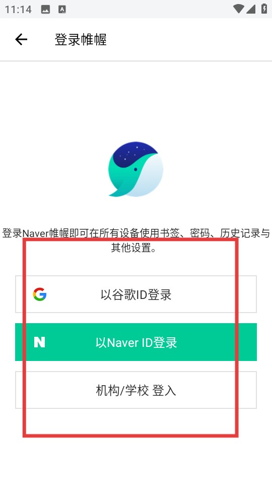2、这是蓝鲸浏览器官方版的登录界面,用户可选择以谷歌ID、NaverID或通过机构、学校登入,登录后能在所有设备同步使用书签、密码、历史记录及其他设置。