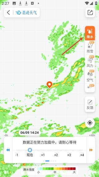 3、点击将水地图页,展示降水分布情况,数据加载中,右侧有降水、风力等查看选项及反馈入口。
