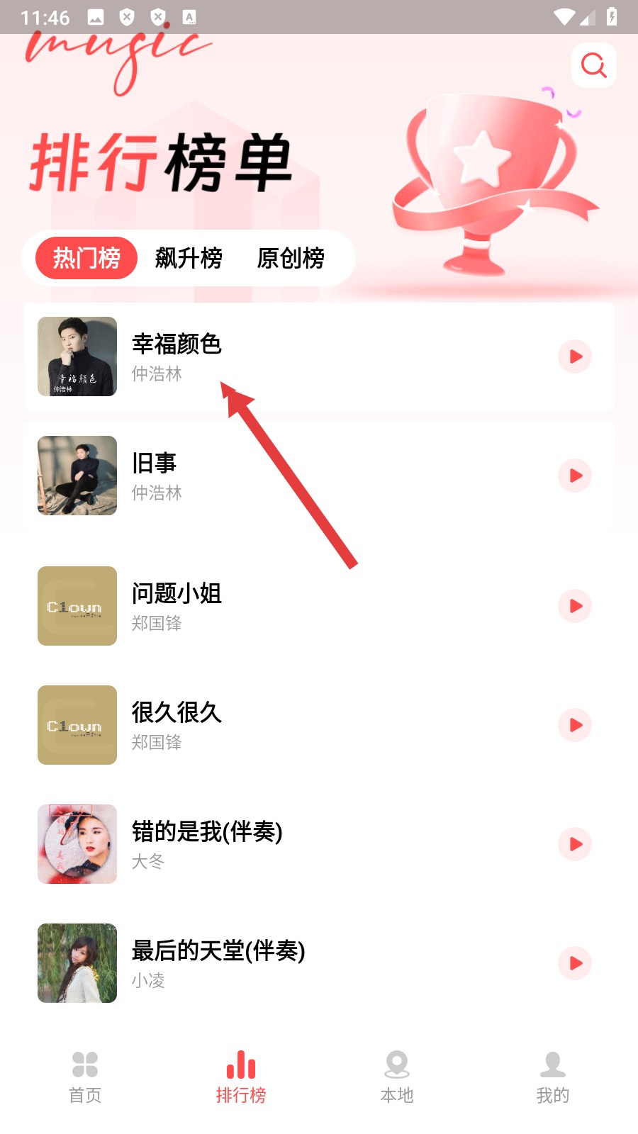 2、在排行榜单的热门榜中,点击【喜欢的歌曲】,就能进入该歌曲的播放界面。