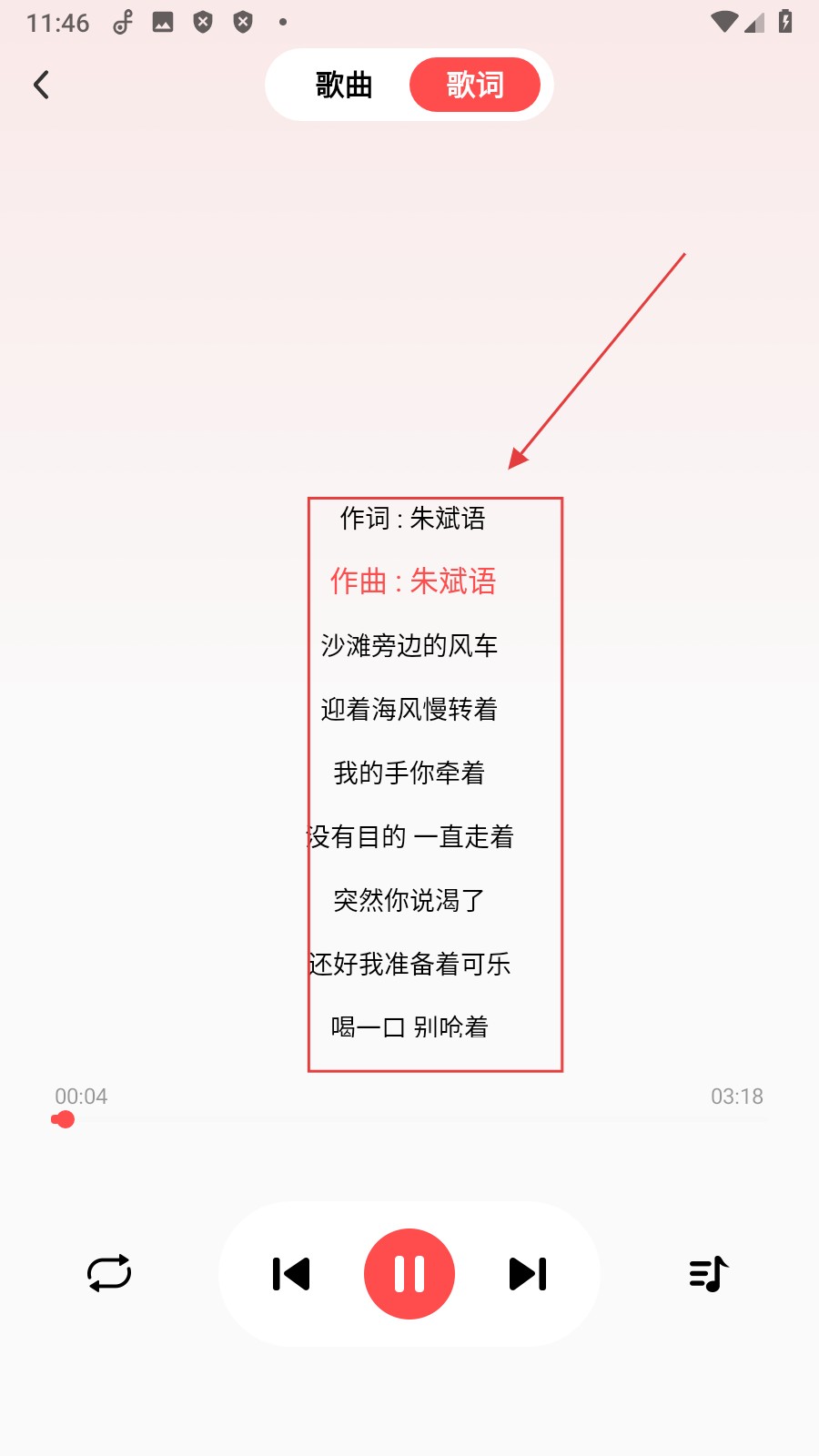 4、切换到歌词页面后,即可看到【歌曲的作词、作曲以及具体歌词内容了】。