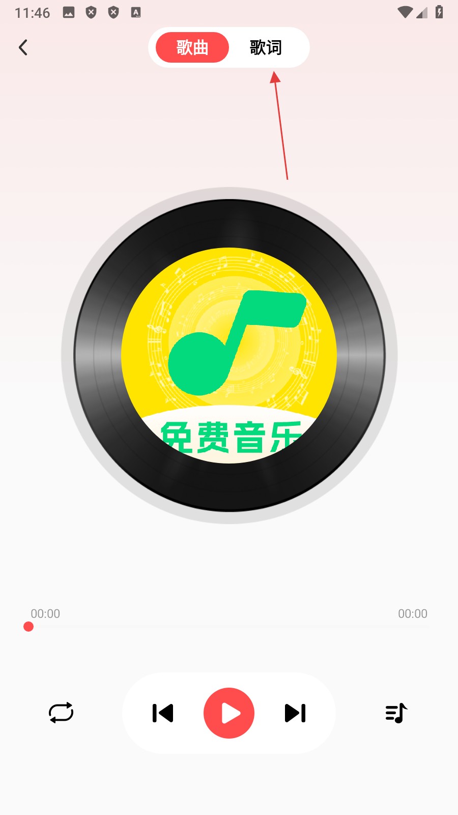 3、进入歌曲播放界面后,点击顶部的【歌词】按钮,切换到歌词展示页面。