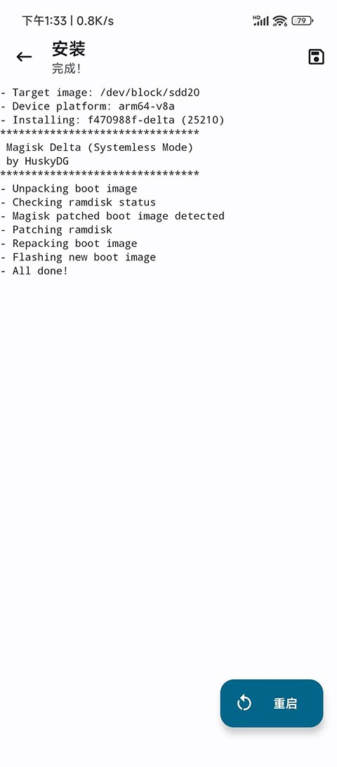 4、刷入完成之后点击右下角重启即可启用模块。
