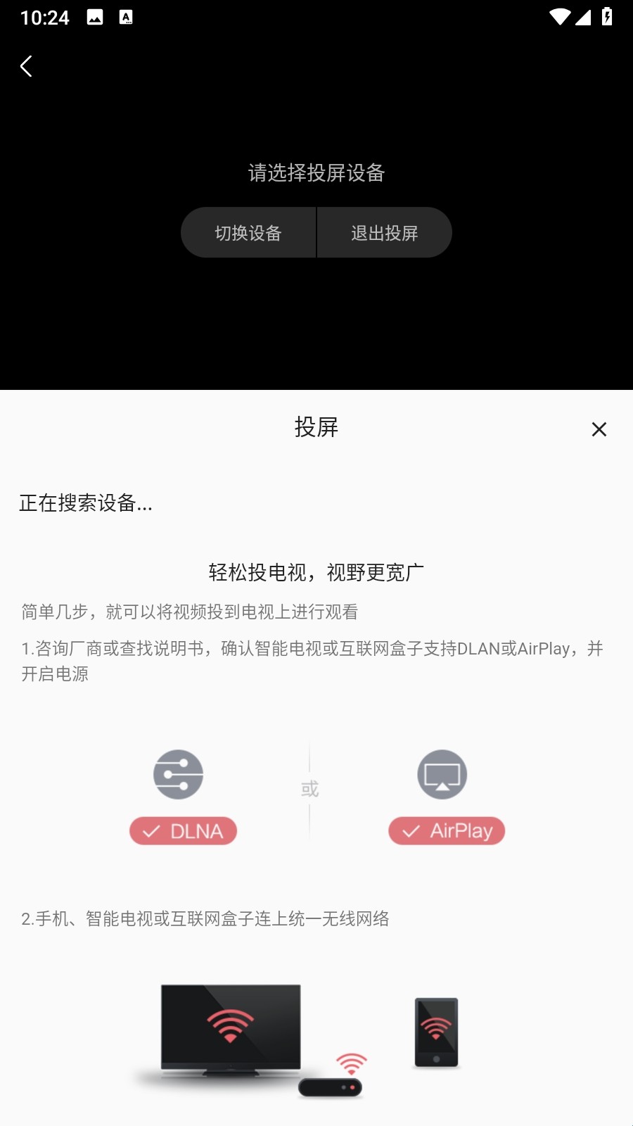 3、点击后系统自动搜索可用设备。按照提示,确保电视和手机在同一个网络下即可。