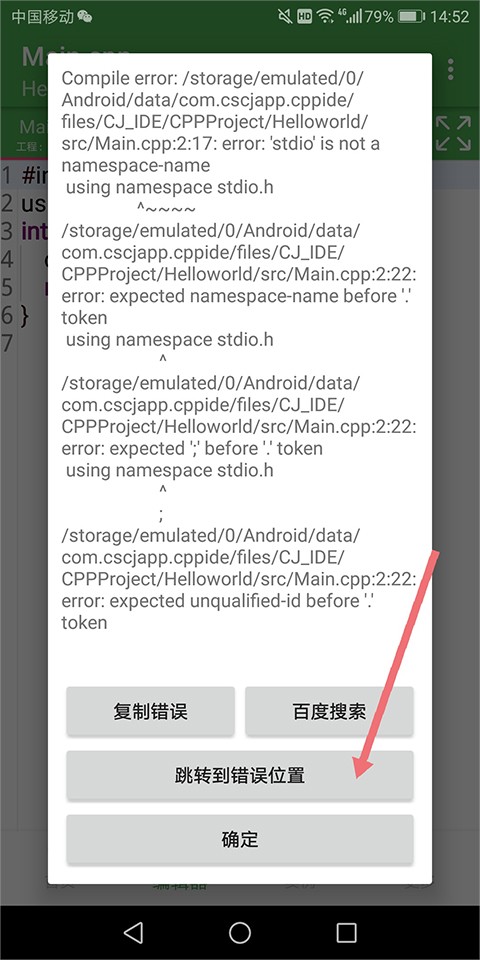 3、点击【运行】可以代码进行编译运行,运行错误时,可在错误信息提示页面中点击【跳转到错误位置】对错误进行定位,以便修复错误