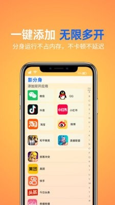 能将手机上的软件添加分身,分身运行不占内存,每个分身支持独立登录账号