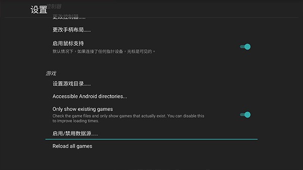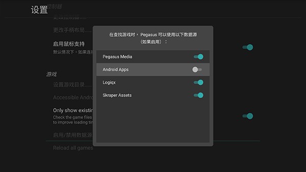 4、因为我们用 Pegasus Frontend 主要针对模拟器游戏,所以不想包括 Android Apps 的话我们可以将来源去掉。打开 Pegasus Frontend 的设置,滑动到「启用/禁用数据源……」