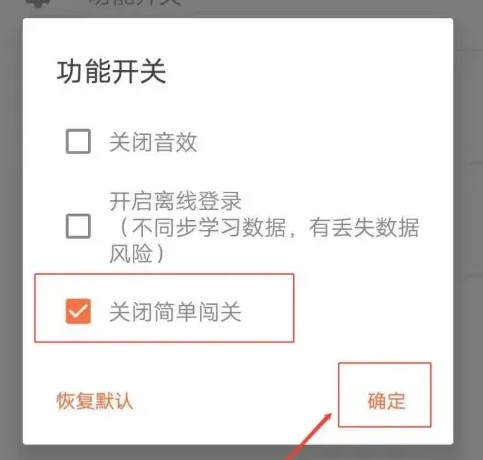 3、点击功能开关,勾选关闭简单闯关,然后点击确定即可关闭。