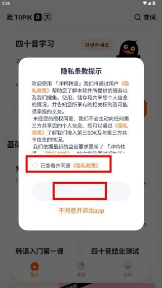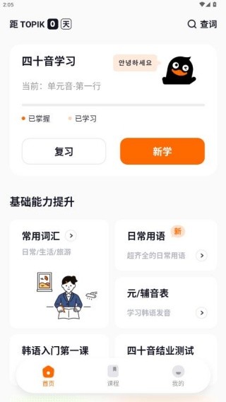 2. 进入软件主页后,即可直接开始学习基础韩语内容。