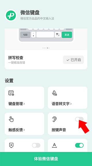 1、下载并打开微信输入法,按照教程启用之后来到下方界面,点击下方的体验微信键盘打开微信键盘输入界面