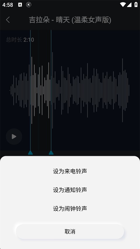 3、截取片段或整首作为铃声,完成后点击下方【设为铃声】;