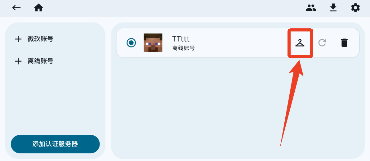 3、准备一个皮肤图片文件,仅限PNG格式,分辨率限制:64x64像素或64x32像素。之后点击账号旁边的衣架选项,在相册选择皮肤图片。