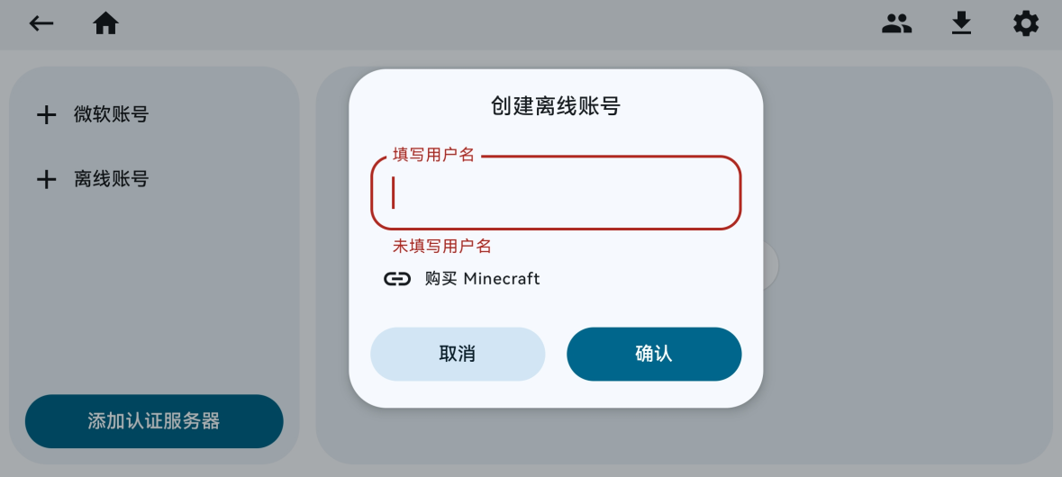 2、这个我们以离线账号为例,点击左边的离线账号,输入用户名点击确认就能创建一个新的账号。