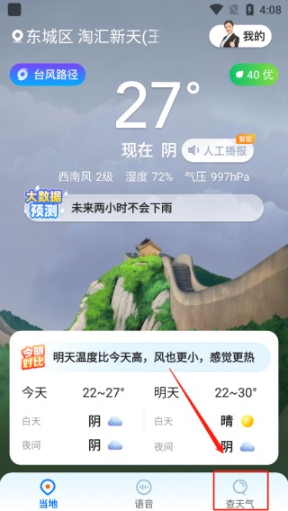 1、下载安装心悦天气正式版,点击下方查天气