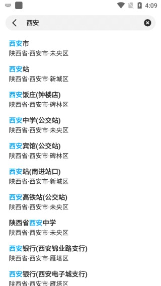 3、以西安为例,输入西安后就会出现一些位置,可以点击,如未央区