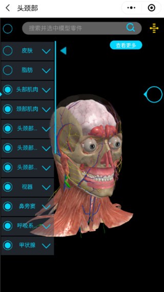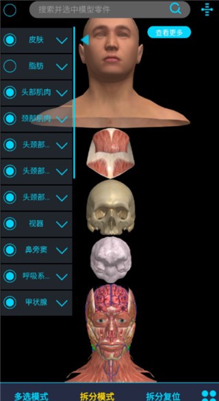 医维度高级查看器主要用于查看医维度虚拟三维数字人体,所有解剖结构均可任意角度旋转、缩放和移动;快速解剖功能可通过调节不同组织的透明度来快速查看器官的层次结构与毗邻关系;拆分模型功能则可将人体各个器官随意拆解取出进行独立观察。