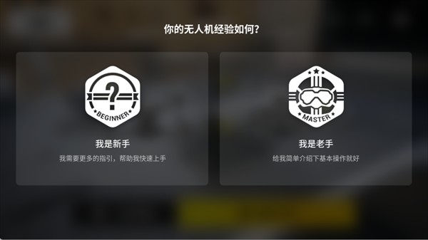 2、根据无人机操作经验选择“我是新手”(获取详细指引)或“我是老手”(快速了解基础操作)。