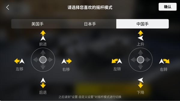 3、选择摇杆模式(美国手/日本手/中国手),不同模式对应摇杆控制的飞行动作不同,选后点“确认”生效。