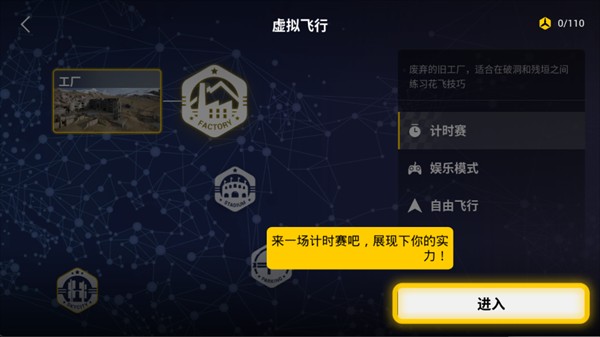 5、选择“工厂”等场景,可进入计时赛、娱乐模式、自由飞行,新手推荐先从计时赛练手。