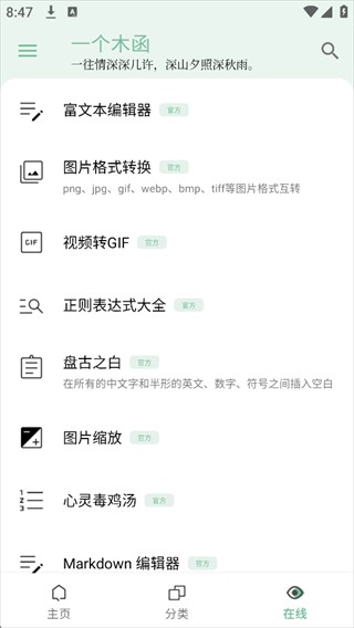 一个木函最新版是一款多功能工具箱软件。软件为用户提供上百种实用工具功能,用户能够根据自己的需求选择并使用软件,充分满足用户的不同需求。且软件不占用过多的手机内存,用户能够随意选择使用软件。需要的用户赶紧来下载吧。
