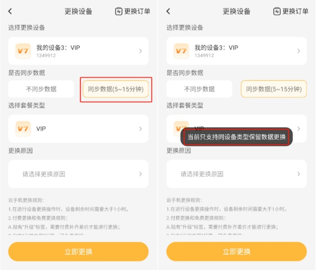 示例:VIP7更换成VIP7可以选择同步数据,但是换成其它的设备类型后就不支持同步数据