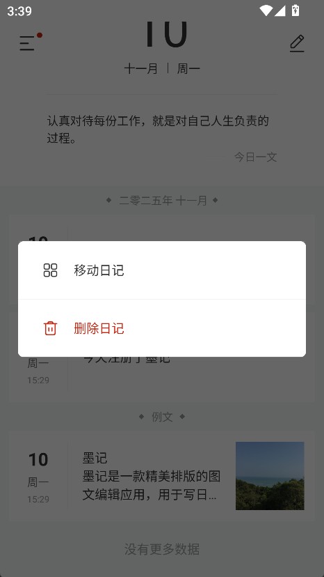 1、在首页列表中找到想要删除的日记条目,长按即可唤出操作菜单。