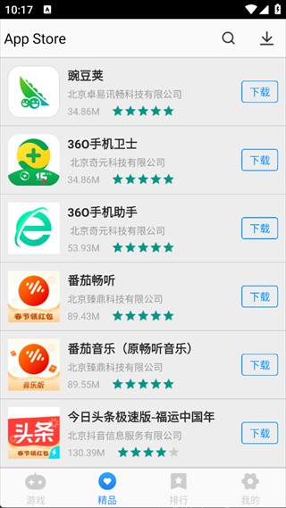 底部含游戏、精品、排行、我的四大核心功能。