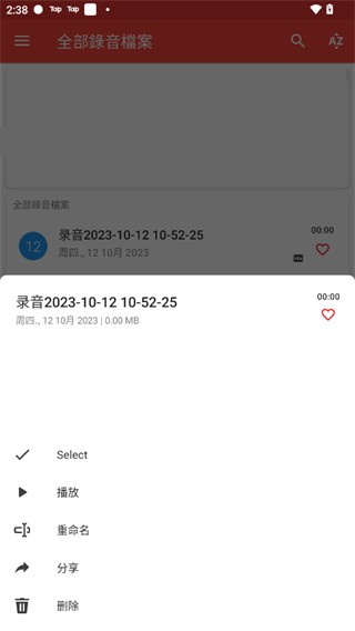 4、所保存的录音在首页即可显示,长按录音,可以进行录音文件的播放,重命名以及删除等操作