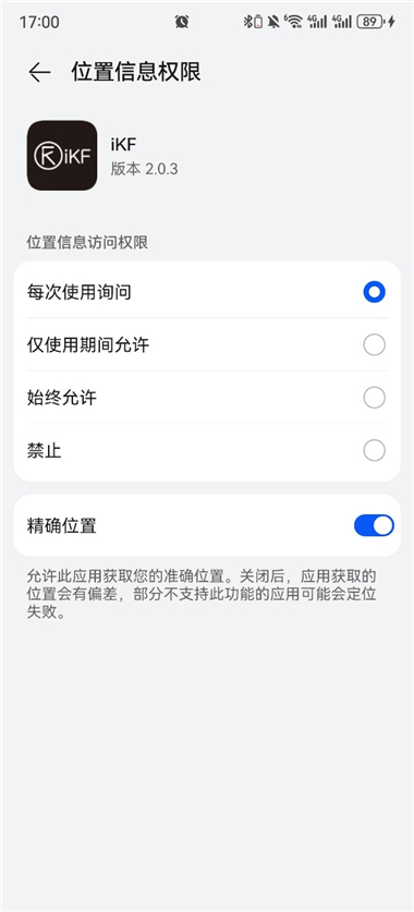 5、补充“位置信息”的权限:打开“设置”-“应用和服务”-“权限管理”-找到iKF-打开“位置信息”-选中“始终允许”。