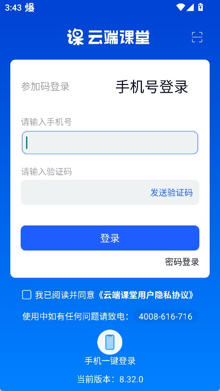 1、打开云端课堂最新版后,可以通过参加码或手机号两种方式登录,任选其一即可。
