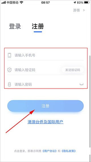 2、输入自己号码以及密码后,获取验证码点击注册。
