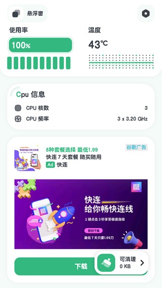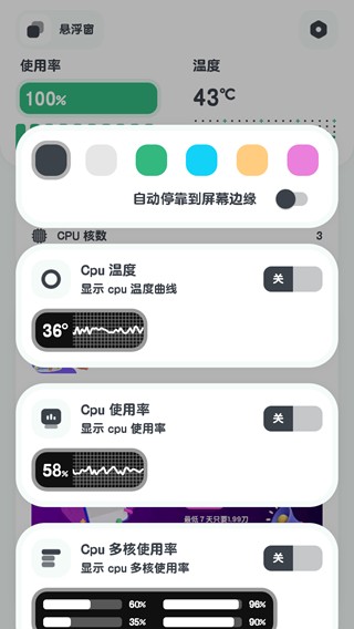 3、悬浮窗功能,可以在界面上呈现温度,使用率等信息。