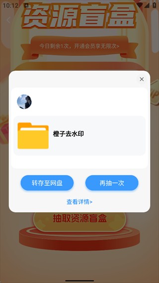 3、在「资源盲盒」中,点击「抽取资源盲盒」按钮,随机获得文件后,可选择「转存至网盘」保存到自己的空间。