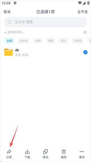 2、点击文件右侧的圆形选择框,勾选目标文件,在底部弹出的操作栏中,点击「分享」按钮。