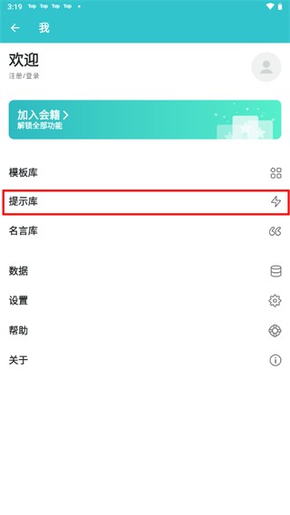 1、首先在我的页面,点击提示库打开。