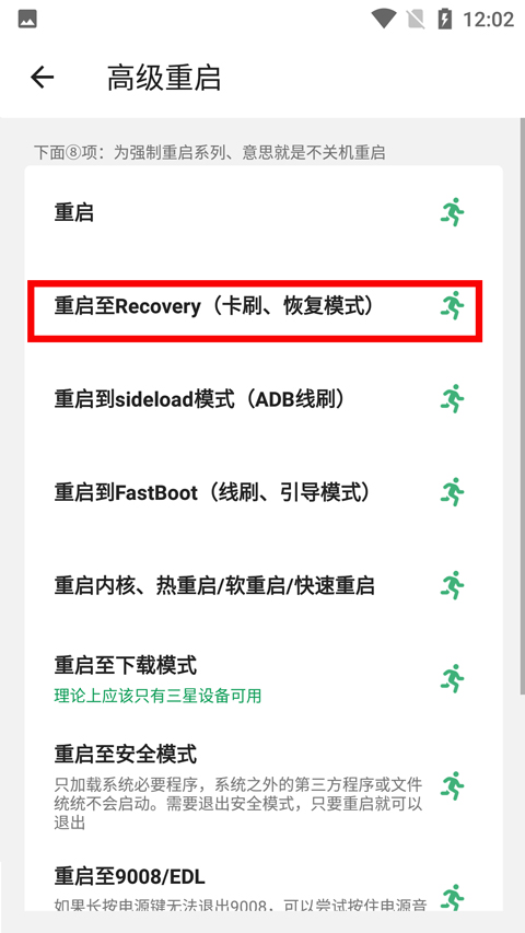 3、直接选择重启至recovery即可;
