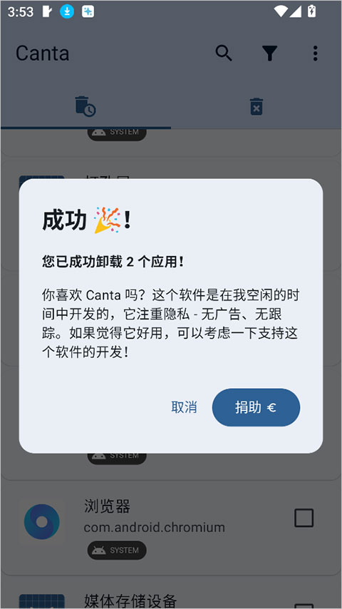 Canta是一款功能非常强大的开源卸载工具软件,这款软件无需root权限,用户可以快速的进行下载,而且这款软件还有各种不同的功能,满足用户不同的使用需求,而且这款软件的所有功能都是免费的,用户可以随意使用,而且优化非常出色,让用户可以在不同的手机型号上流畅使用,有需要的用户一定不要错过,快来下载使用吧。