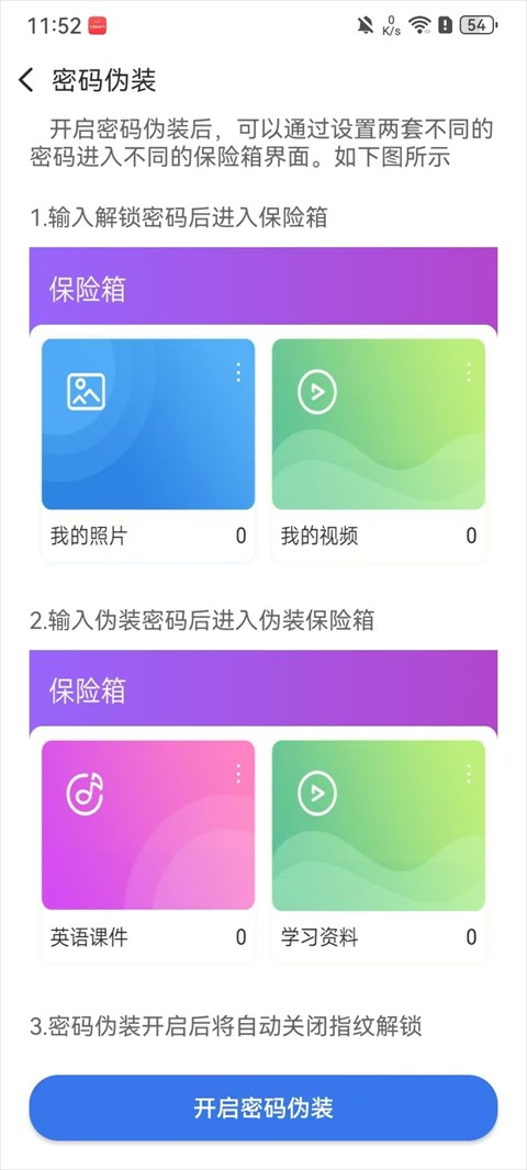 视频保险箱官方版是一款功能强大的手机信息加密软件。软件为用户提供个人专属的隐私空间,用户能够将自己的文件和各种隐私信息进行保存和隐藏,确保用户的隐私数据安全。还有多种模板和辅助功能,满足用户的不同使用需求。需要的用户赶紧来下载吧。