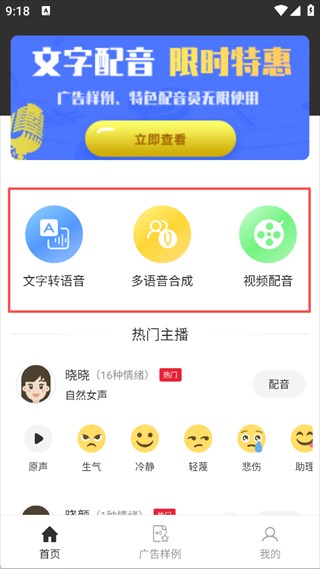 1、进入视频配音免费版首页,您将看到文字转语音、多语音合成和视频配音三大核心功能,同时也有热门主播的配音选项供您选择。