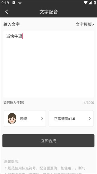 5、在配音文本框中输入您的配音内容,选择合适的主播及语速设置,然后点击“立即合成”生成音频。