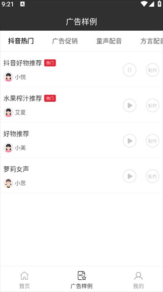 7、除了自定义配音外,视频配音App还提供丰富的广告模板,包括抖音热门、广告促销等分类模板,您可以直接试听或制作,满足各种广告创作需求。