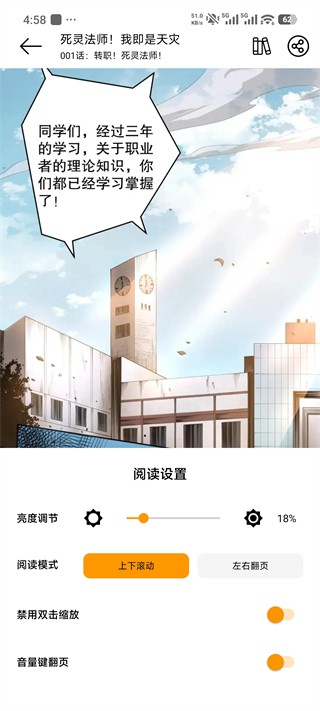 4、阅读中能调亮度、切换上下滚动/左右翻页模式,还能开音量键翻页。