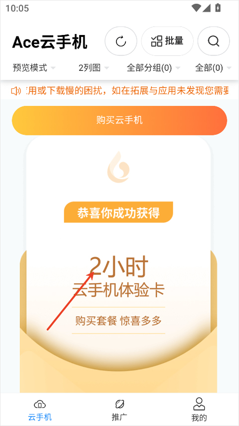 1、打开ace云手机app,注册完成之后,我们就能够免费领取到2小时的云手机体验卡;